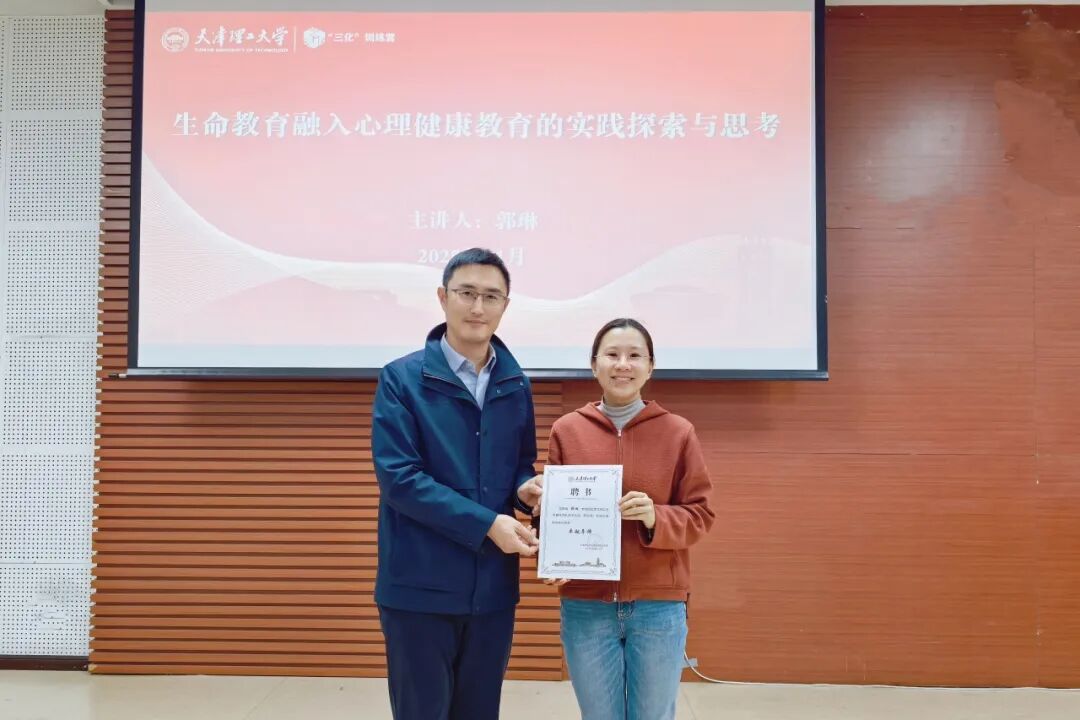 专题报告后,校党委学工部负责同志为郭琳老师颁发聘书,正式聘请她为天津理工大学辅导员“三化”进阶提升训练营“卓越导师”,以期持续深化交流,发挥专家引领作用,助力我校辅导员队伍建设高质量发展。